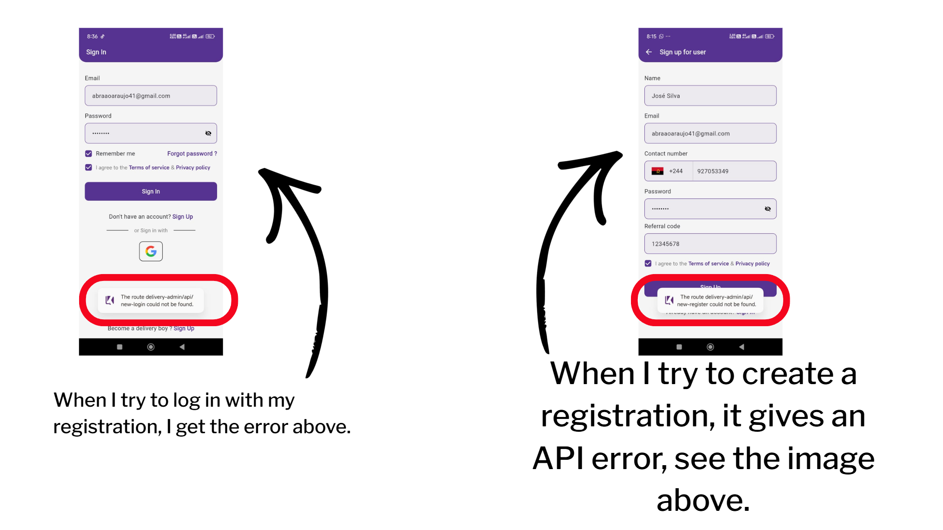 I need help with something. When I try to log in or create an account, I get an API error. Please see the attached image.