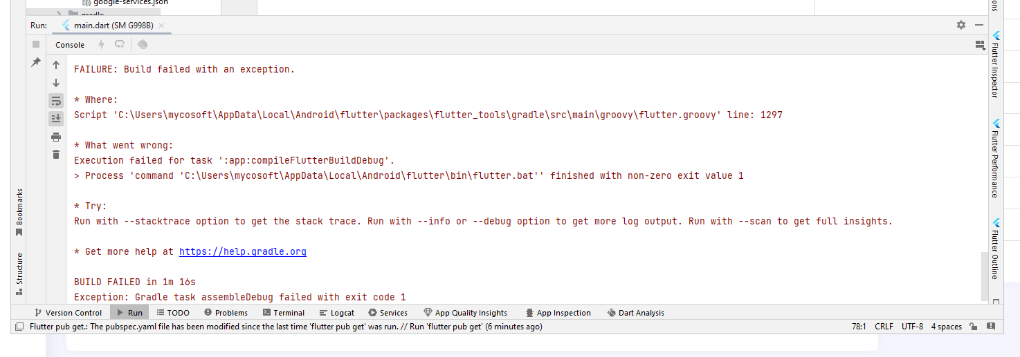 > Process 'command 'C:\Users\mycosoft\AppData\Local\Android\flutter\bin\flutter.bat'' finished with non-zero exit value 1