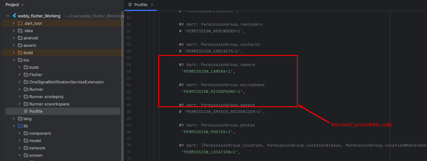 For IOS you have to comment or remove the permission code from the Podfile as shown in the attachment